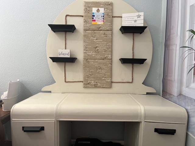 What started as a broken-down dressing table is now a vintage-inspired desk with tons of storage and character. I love having the drawers, shelves, and cork boards for organizing craft supplies and papers. The antique white paint gives it a clean, fresh look, while the little ridges and quirks remind me of its story.